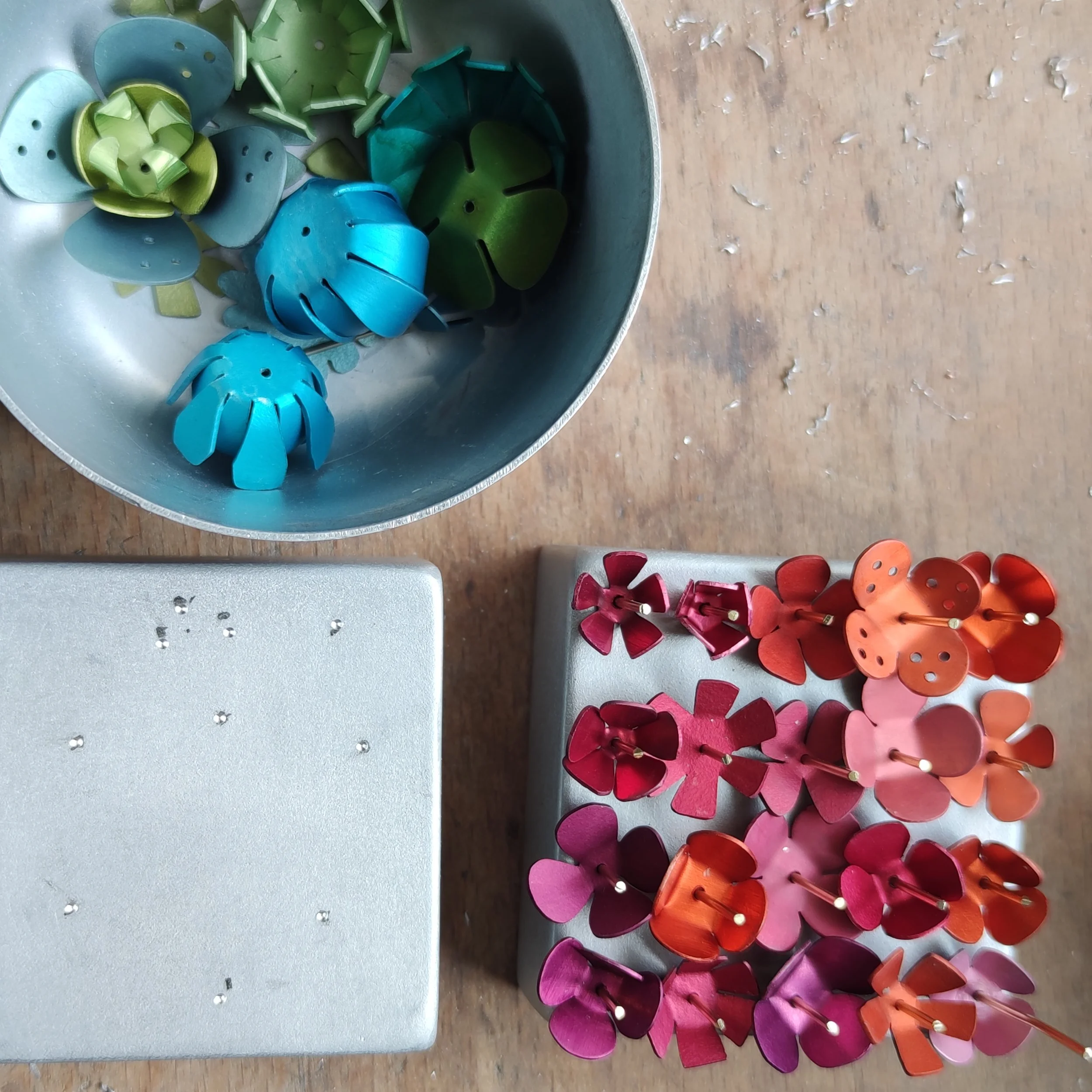 Combining traditional silversmithing and coloured anodised aluminium, my work is made in my studio, with meticulous care, following a slow-making philosophy.  Colour is applied using printmaking, dyes, and resist techniques that I have adapted over the past two decades to successfully work on anodised aluminium.