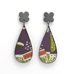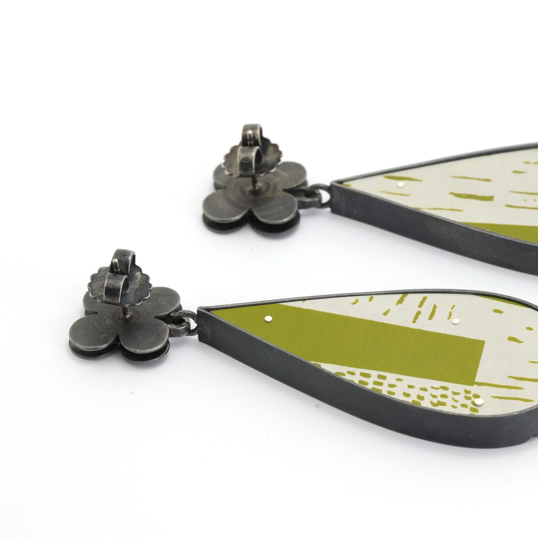 Made from patterned aluminium, hand-screenprinted with colour, framed in the dark tones of oxidised silver. These hollow forms are lighter on the ear than they suggest and comfort to wear, they move freely below the retro flower shaped upper section and hang from layered silver studs.