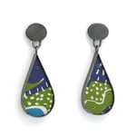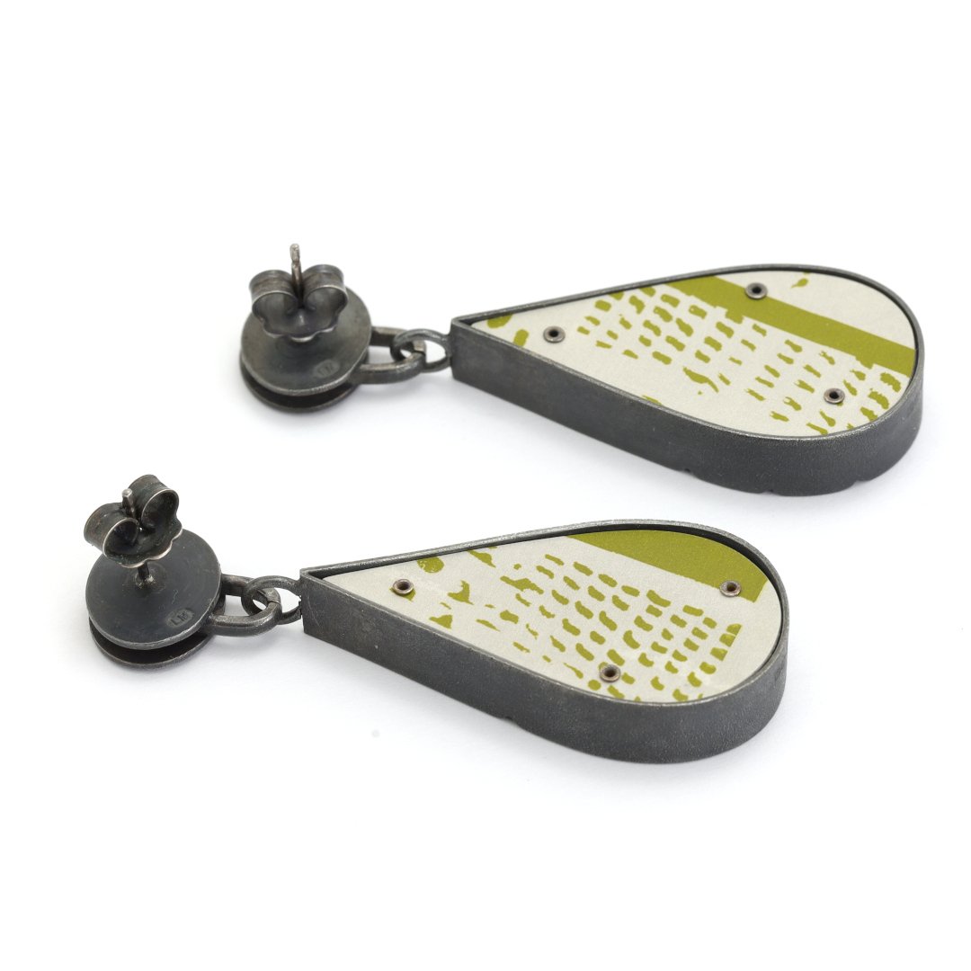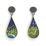 Comprised of patterned aluminium, hand-screenprinted with colour, framed in the dark tones of oxidised silver. These hollow forms are light on the ear and comfort to wear, they move freely below the retro flower shaped upper section and hang from layered silver studs.